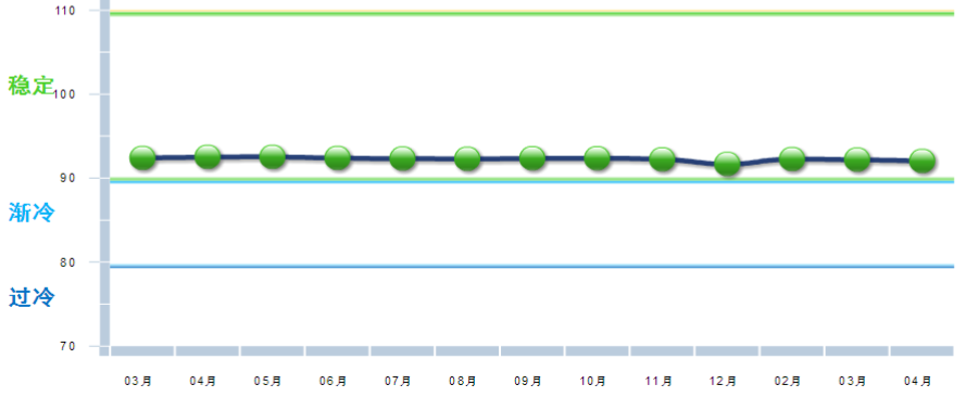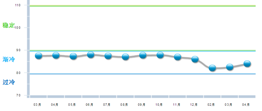 中國輕工業(yè)經濟運行及預測預警系統(tǒng)數據顯示:2018年開年,中輕景氣指數延續(xù)去年四季度以來的下降態(tài)勢,連續(xù)3個月在藍色“趨冷”逐月下行,4月中輕景氣指數止跌回升,為88.80,環(huán)比3月回升0.98。